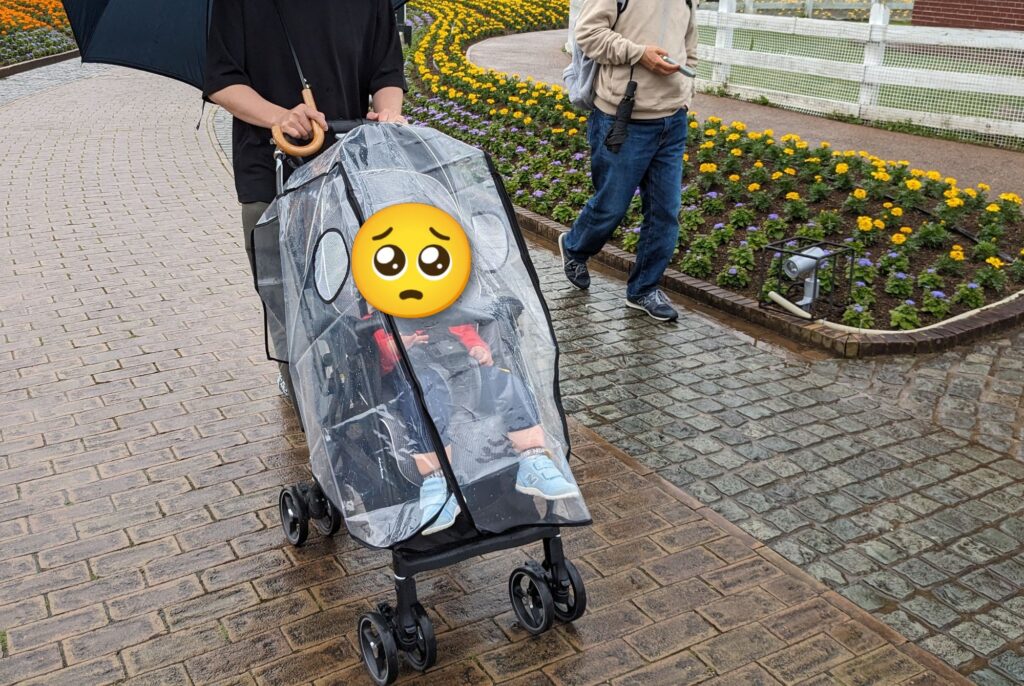 雨の場合は、雨除けカバーが大助かり!必須アイテムです。