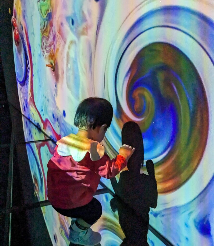 海のファンタジアと同様、壁に映像が映し出される展示でしたが、少し内容が難しく、暗闇が多かったため、息子は機嫌が悪くなってしまいました。